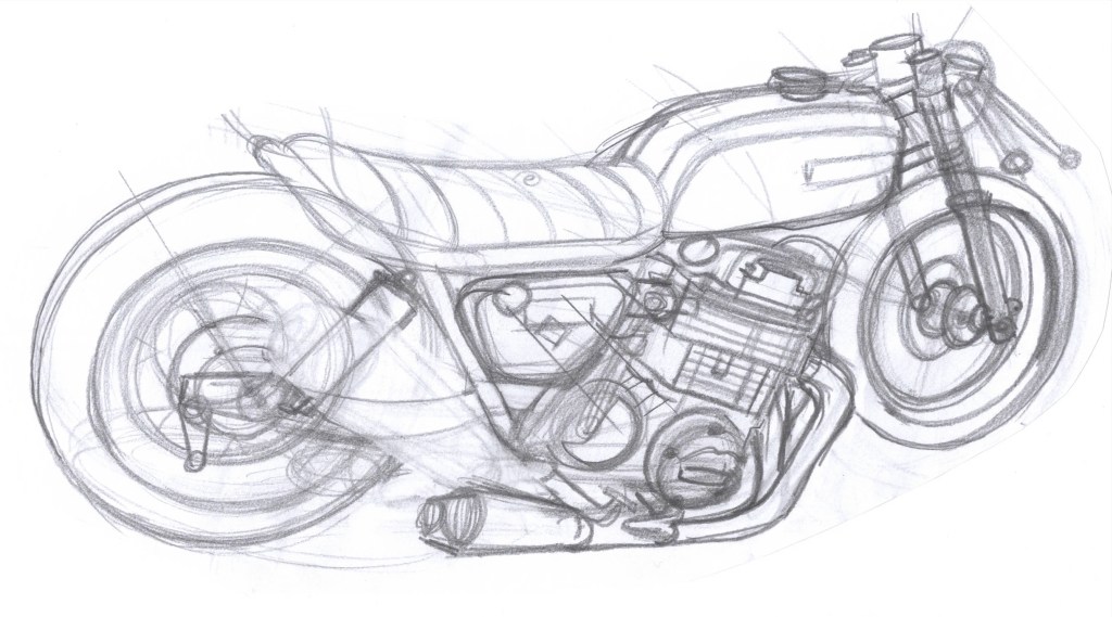 I told Subalpin I would have to draw another bike. I wanted to draw the bike I used to own in 1989, a Honda CB750Four (from 1976, the time it was so uncommon to have four inline cylinders on a motorbike, that you had to mention FOUR in the name) because that bike would look cool slammed down like that.