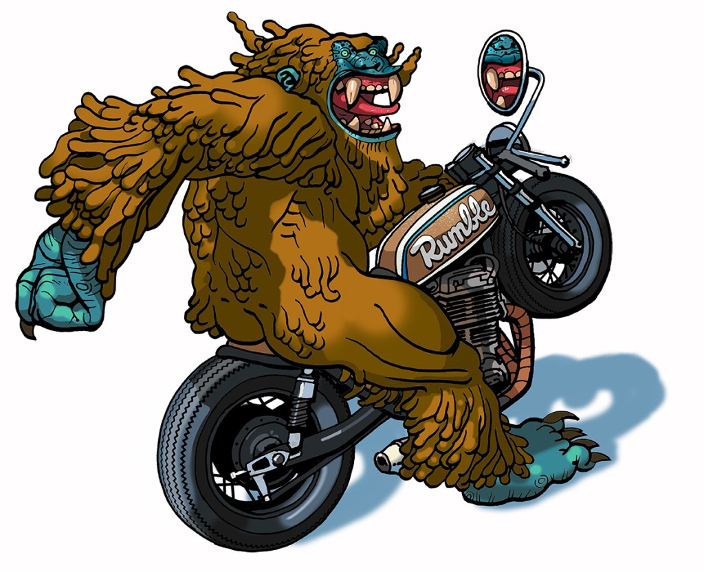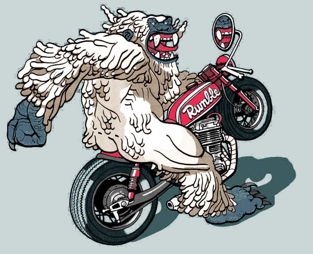 My friend Subalpin, genius graphic designer, asked me to do a t-shirt design for his Rumble Speed shop, a vintage bike restomod and tuning shop that also sells apparel, clothing, all overseen by Subalpin’s sense of style. ‘So… what would you want on the shirt?’ I asked him. Well, obviously a bike. And seeing how I have been obsessed with sasquatches and yeti’s since childhood, a yeti or a bigfoot should be riding it. What bike? He wanted a Yamaha XT, the iconographic off-road bike from the ’80’s. Every guy that had seen Sylvester Stallone riding one in ‘First Blood’ wanted that bike.